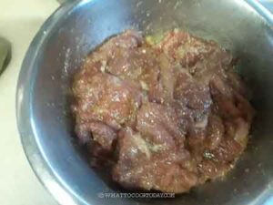 Use your hand to mix everything, rubbing the seasoning into the meat. Make sure the pork slices are evenly seasoned. The mixture will be damp now because the sugar has melted and all the seasonings will stick to the meat nicely