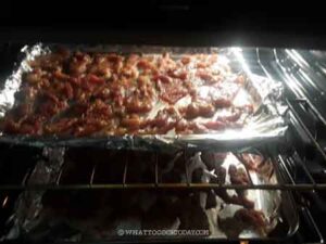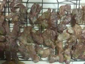 Place the baking pans on the positioned rack and bake for 20-25 minutes or until the pork is dry to the touch. Flip each side to the other side and bake again for another 20-25 minutes or until dry to the touch. The texture of the pork slices will be "leathery" at this point. They are not ready to be consumed yet at this point and still need to be fried
