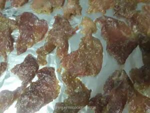 IMPORTANT TIPS: We don't want to dry the pork until it's bone dry like the American meat jerky, which is tough and super chewy. The baking is only to dry the surface of the jerky. The inside is still "moist". That's why the texture will be "leathery" or "rubbery". The texture is flexible
