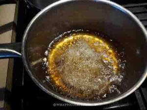 Preheat oil that is suitable for frying, like vegetable oil, canola oil, avocado oil, or any oil of your choice, over medium heat. If you stick a skewer into the oil and you see bubbles sizzle around it, the oil is ready