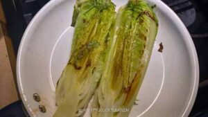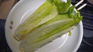 Preheat a grill pan or large non-stick pan (I need a larger pan!). Add about 1 Tbsp of oil on the pan. Place the cut-side of the lettuce down on the pan and let it grill for about 1-2 minutes until you see some charred spots or grill marks.