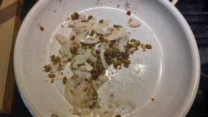 I used unsweetened coconut chips, which are quite large in size, so I broke them into smaller pieces. Combine all the ingredients for the topping in a bowl. Toss to roughly combine them. Pour into a non-stick pan over a medium heat. Keep stirring until the sugar starts to melt. Watch the heat because the sugar can burn easily at any point. Lower the heat a bit if needed.