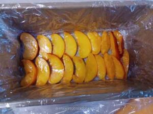 This is an upside-down icebox cake. So the bottom will be the top. Arrange the nectarine slices decoratively at the bottom of the pan