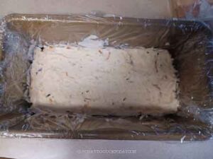 Unwrap the cling wrap. Put a serving plate on top and then quickly but carefully flip it over. Remove the loaf pan and gently peel off the cling wrap. Use a sharp knife to cut into serving sizes