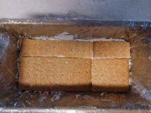 Lay the graham cracker pieces on top. Cut the cracker into sizes to fit snugly into the pan if needed