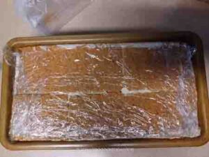 Use a 8 1/2 x 4 1/2 loaf pan. Line the pan with an oversized cling wrap, overhanging on all sides