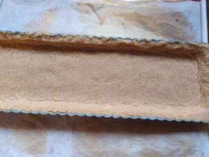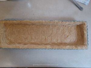 Press the crumbs into the bottom and the sides of the tart pan. Spend time to really press the crumbs into the tart pan. This is important so the crust won't fall apart later. I use the bottom of a measuring cup to really press the crumbs. Use your fingers to help press the crumbs along the sides of the tart pan too.