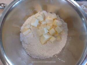 Combine flour, salt, sugar in a mixing bowl. Add butter pieces.