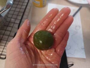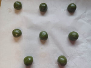 Preheat the oven to 350 F (180 C). Line two baking sheets with parchment paper. Divide the chilled dough into 16 portions (~24g each). Lightly oiled your palms and roll into a dough ball