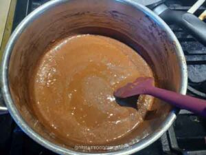 Combine cocoa powder, instant coffee, and milk in a saucepan. Whisk until combined. Put this on the stove over medium heat. Add butter cubes and cook until the butter melts and mixture starts to come to a boil. Lower the heat to simmer and let it cook for about 5 minutes