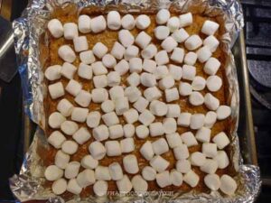 Remove from the oven, scatter the mini marshmallows over the top, and move the pan to the upper third rack.