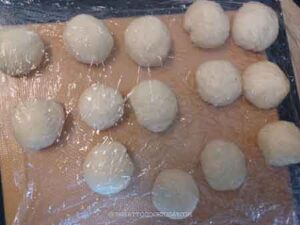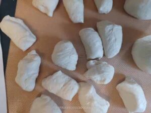 Lightly dust your working surface and your hands with flour. Deflate the dough by folding the edge towards center. Divide into 30 pieces of smaller doughs using a bench scraper. You can make them smaller by dividing into 35-40 pieces too.