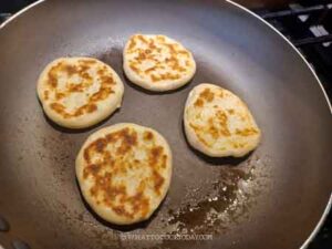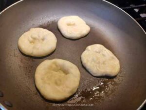 When it's hot, brush the skillet with some melted ghee. Place 3-4 mini naans on the skillet and let them cook until they start to puff up and you see light brown spots at the bottom, about 15-20 seconds