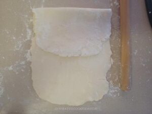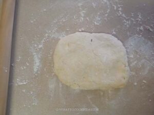 Dust the work surface with a little flour, because the dough will be moist. Use a lightly floured rolling pin to flatten the dough, then roll it out, rolling just to the edges, not over them