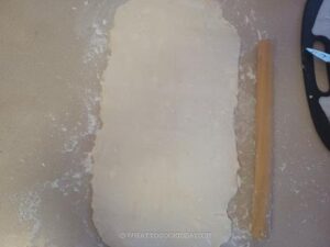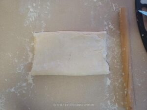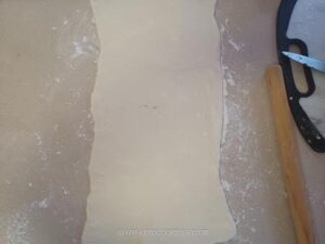 Roll the dough out to a rectangle about 6 x 18 inches. The dough might be moist after being chilled, you can lightly dust some flour to keep it from sticking to the surface and your hand
