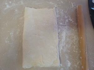 Roll the dough out from the center outward, until once again the rectangle measures about 6 x 18 inches. Dust off any excess flour. Fold the third top and the bottom over. Repeat this process 4 more times. A total of 6 times. If the dough is getting too warm and butter starts to melt, refrigerate the dough for 10-15 minutes and then resume working on it again