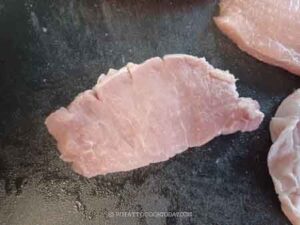 Make a few small cuts on the fat part of each pork stlice so they will cook without shrinking.