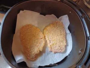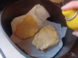 Spray with generous amount of cooking spray or brush both sides of the breaded cutlet with some oil. This helps to achieve a golden-brown crust in the air fryer. Line the air-fryer basket with parchment paper. Place the cutlets on top of the parchment paper