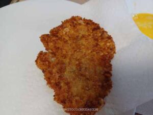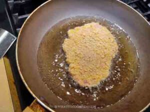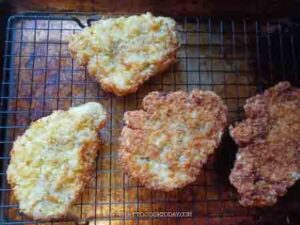 Deep-fry each pork steak on medium heat until they are cooked through and golden brown, about 2-3 minutes. When cooked, drain on a rack or some paper towels to remove and excess oil. Remove any bits of bread crumbs from the oil as these will get burn
