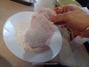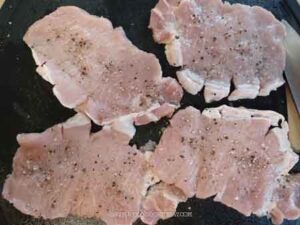 Cover the pork with a cling wrap and pound each cut of pork with heavy object (meat pounder or pestle will work), about 1 -1.5 cm in thickness. Season with salt and pepper