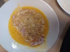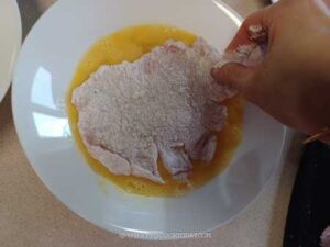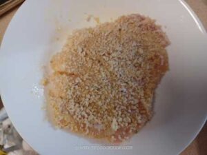 Prepare three shallow plates. One fill with all-purpose flour, another one with beaten egg, and lastly with panko bread crumbs