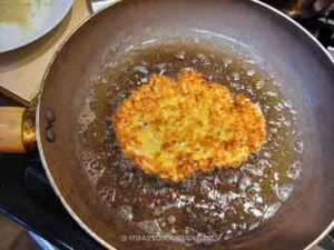 Heat the oil for deep-frying in a deep saucepan, about 2-inch high. Check the temperature by dropping a few breadcrumbs into the oil-if they float immediately, it is at the correct temperature (340F)