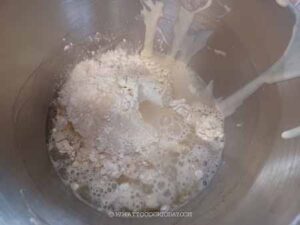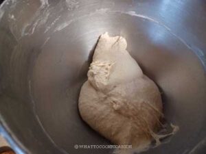Knead the dough for 5 for 6 minutes (on medium speed 4 on Kitchen Aid), or knead by hand for about 10 minutes, until smooth and elastic. It should clear the sides of the bowl but still stick to the bottom.