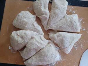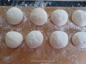 Round the dough up by pulling the edges towards the center. Place seam side down and rest them for 5 minutes, covered, to relax the gluten.