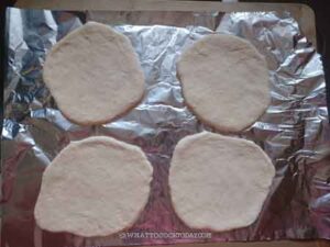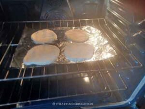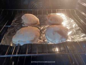 Line a piece of aluminum foil (shiny side up) and lightly grease it with oil on an inverted baking pan or rimless cookie sheet. We won't be baking with the pan but the pan just makes transferring the foil with the proofed pita bread on top of it, to the oven much easier.