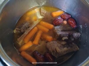 I didn't add the veggies together with the meat because they will be way overcooked. Add the carrots, radish, chestnuts, and red dates into the pot.