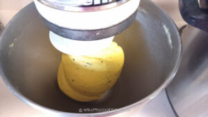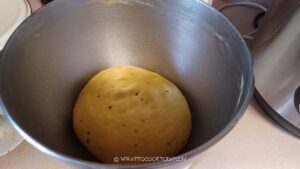 The dough will clear the sides of the bowl but sticky to the bottom of the bowl. The dough is slightly sticky to the touch and that's normal and a sign that the bread will stay soft longer