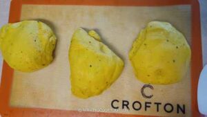 Deflate the dough, pushing out all the air and divide into three equal portions of dough. Round each one up again and cover and let them rest for about 5 minutes