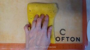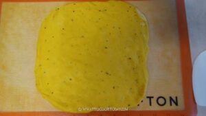 Work with one dough at a time. Flatten the dough with your palm and roll it into a rectangle shape, the width should be about twice the width of the loaf pan and about the same length as the loaf pan.