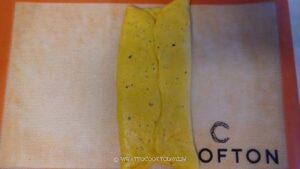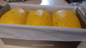 Place the shaped dough into the pan. Repeat with the other two doughs. Place all the shaped dough side by side inside the loaf pan. Slightly flatten the three doughs with your palm so they are about the same height