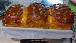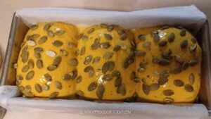 Whisk the egg with milk for an egg wash. Brush the surface with an egg wash. Sprinkle with some pumpkin seeds or other seeds of your choice or leave it blank if you prefer