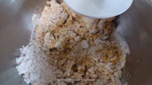 Start the mixer on low ("stir" on KA) and knead for about 2 minutes. It should come to a rough dough. If it's too dry, you can add a bit more milk, 1 tablespoon at a time. Once you have a rough dough that is slightly sticky, increase speed to 4 and knead for 7-8 minutes