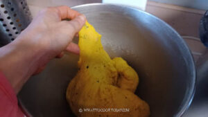 When you stretch a small amount of the dough thinly, it won't break. You can stop kneading at this point