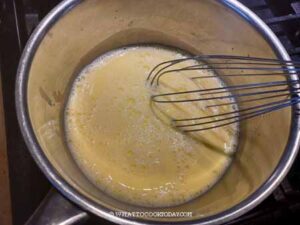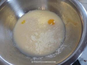 Whisk milk, coconut water, salt, cornstarch and egg yolks in a mixing bowl.