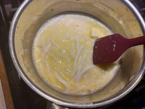 Put the saucepan on the stove over low heat and keep whisking. It may seem like nothing is going to happen at first but keep whisking and you will start seeing some lumps and the mixture will thicken. Stir in the butter, raisins, and coconut meat and keep whisking until the butter melts.