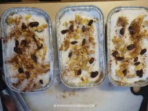 Divide the meringue equally among the pan. Use a rubber spatula to spread the meringue on top of the custard and then smooth with the spatula. Sprinkle with some raisins, chopped walnuts, and ground cinnamon on top of the meringue