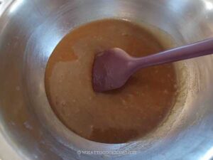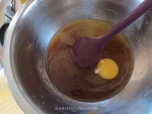 Melt the butter in a pan. Add brown sugar and whisk. They may not combine well at this point and the mixture doesn't look right, but no worries. Set it aside to cool down to warm before adding eggs (we don't want to cook the eggs)