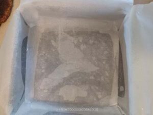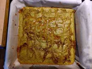 Preheat oven to 350 F (180 C) for conventional oven, 330 F (165 C) for convection oven. Use a non-stick spray or grase a 8 x 8 inch square pan. Line with parchment sling for easy removal