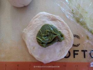 Work with one dough at a time. Flatten one piece of dough into a disc, about 3-4 inches in diameter. Scoop a heaping spoonful of the ganache onto the center. Try not to stuff too much (I did and some of them leak out)