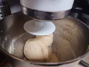 Increase the speed to 4 and continue to knead until the dough is relatively smooth. You need to stop and scrape the dough off the hook and the bowl several times during this process