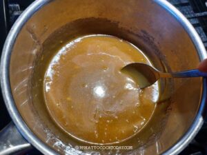 Quickly but carefully invert the pan. Let it sit like this, do not remove the 9 x 9 pan. Let it cool down this way for at least 20 minutes. If you remove the pan now, the caramel is still hot and thin and it just gushes out. The caramel thickens up and becomes gooey when it cools down. So let it sit and thicken up