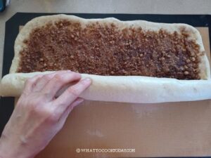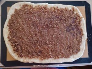 Spread the melted butter on top of the dough, leaving 1/2 inch along the edges. Sprinkle the cinnamon sugar filling all over, leaving 1/2 inch along the edges. Use your clean hands to press the filling into the dough. The melted butter helps to keep the filling in place. Sprinkle half of the walnuts on top