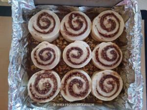 Check for doneness by using a toothpick inserted into the center piece of the bun. It should come out with some sticky caramel is okay, but no sticky dough. If it does, bake for another 5 minutes and test again.