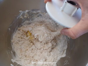 Knead the dough on low speed until all the crumbly dough starts to come together into one mass, it may take about 2-3 minutes for this to happen. Don't try to add any flour or liquid. You may need to stop halfway and scrape the dough off the hook and the sides of the bowl and knead again several times