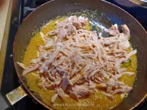 Add the chicken broth and bring to a boil and then lower the heat to let it simmer for about 3-5 minutes or until some of the extra liquid has evaporated and the chicken is moist but not soupy. Have a taste and adjust seasoning if needed. Turn off the heat.