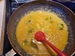 Add the lime leaves, turmeric powder, salt, sugar, chicken bouillon, and the broth. Stir to mix everything evenly, cook for about 1 minute.